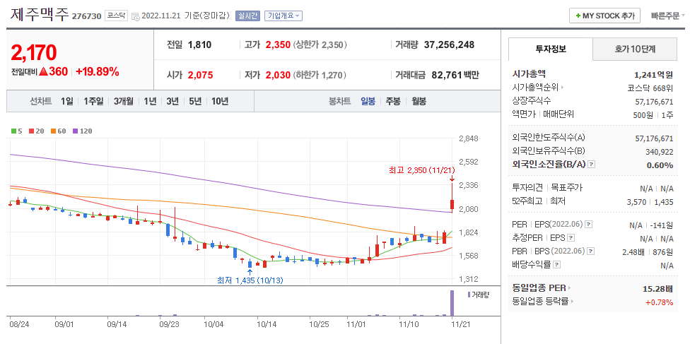 [뉴스투데이=김소희 기자] 제주맥주 주가가 급등하고 있다. 21일 한국거래소에 따르면 오전 10시 49분 기준 제주맥주 주가는 전일 대비 400원(22.10%) 오른 2210원에 거래되고 있다. 제주맥주 주가 급
